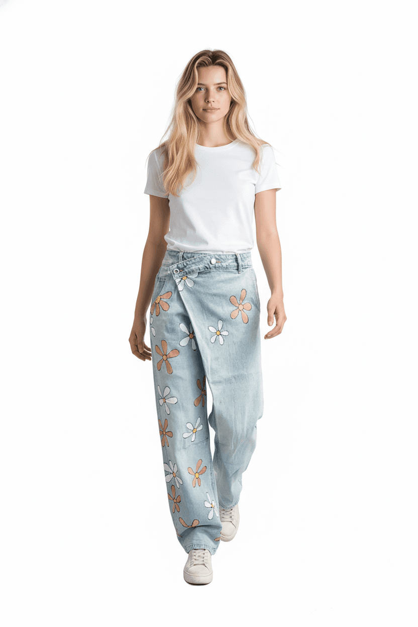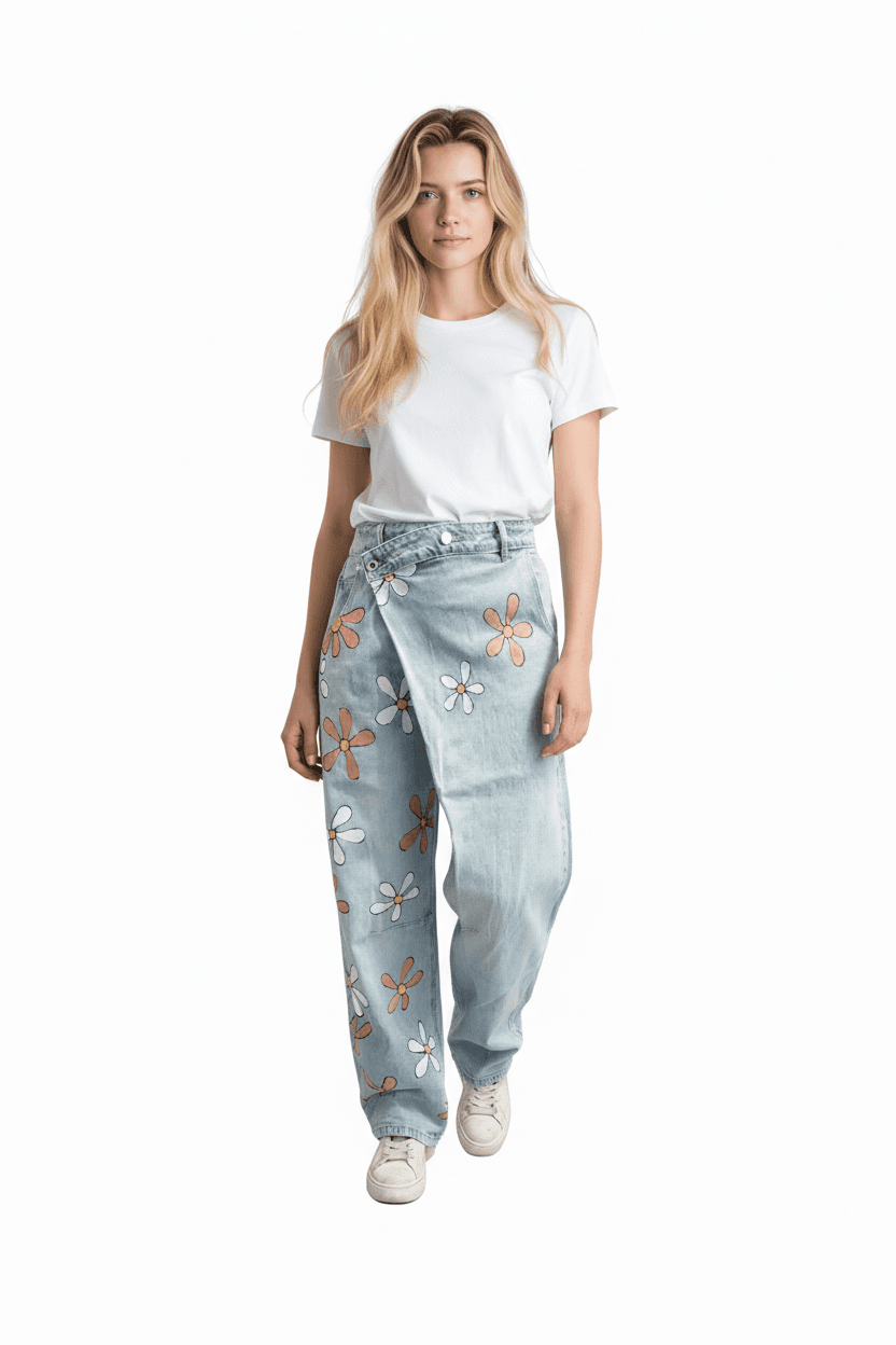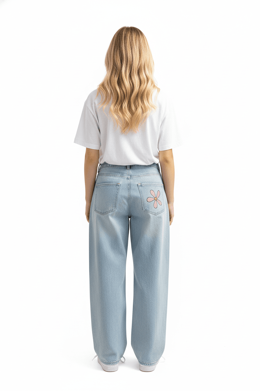 Bloom è un jeans artigianale dipinto a mano, realizzato su denim selezionato e decorato con motivi floreali esclusivi. Ogni capo viene lavorato singolarmente con colori professionali per tessuti, rendendo ogni jeans unico e leggermente diverso dagli altri.
