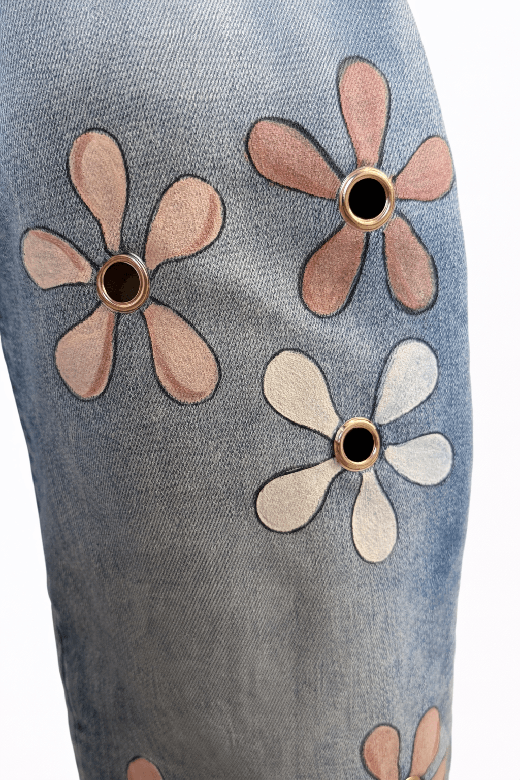 Blushbloom è un jeans in denim chiaro dal fit rilassato, decorato con fiori nei toni delicati del rosa e del bianco distribuiti su tutta la superficie. A rendere il modello ancora più originale sono gli occhielli applicati al centro di ogni fiore, che creano un piccolo foro decorativo e donano al capo un dettaglio inaspettato e distintivo. Un jeans femminile, creativo e ricercato, perfetto per dare personalità anche agli abbinamenti più semplici.