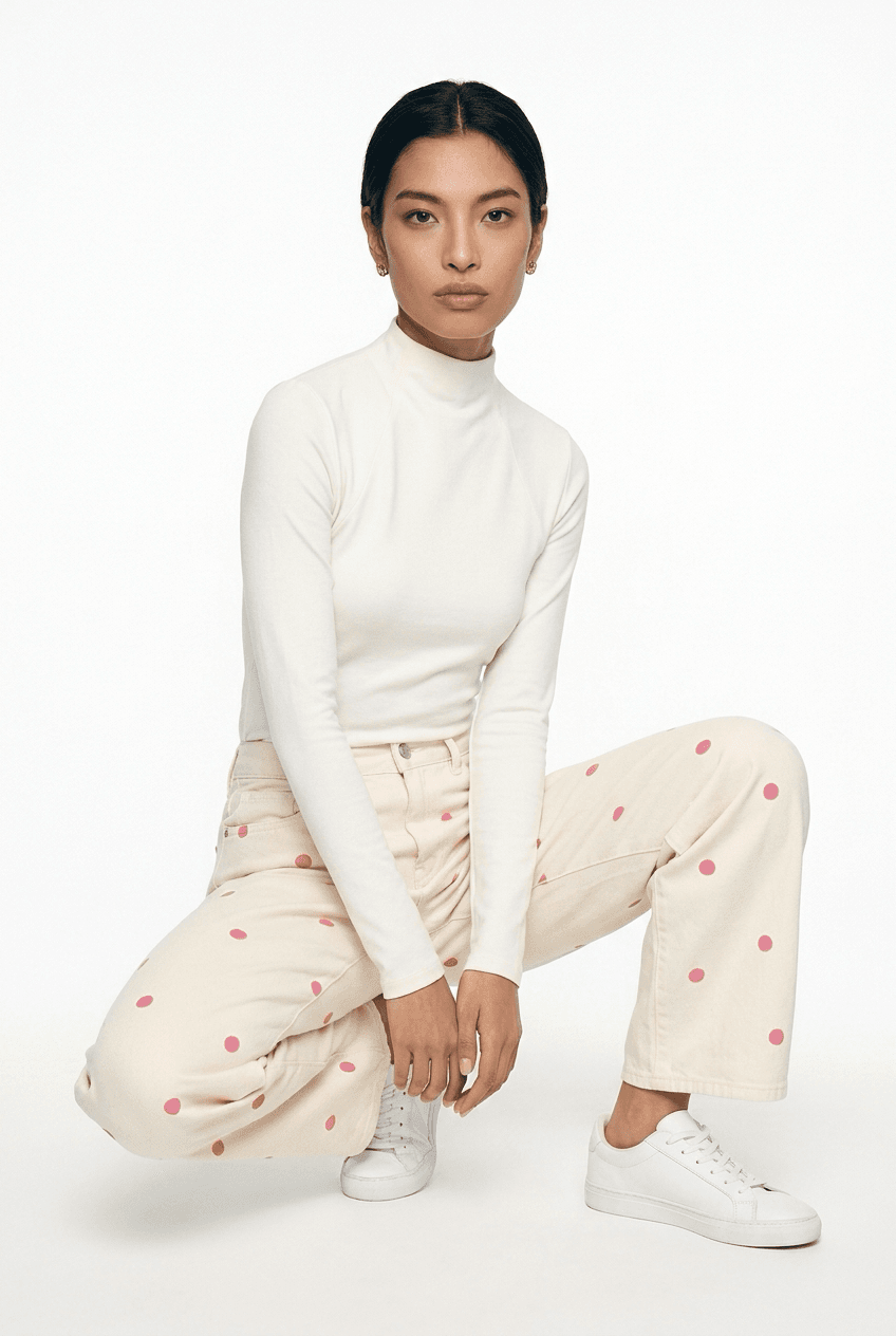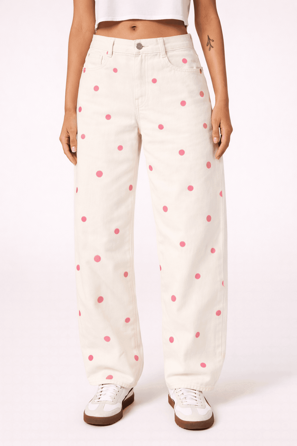 Candy Dot è un jeans baggy balloon off white con pois dipinti a mano. Un capo unico che unisce denim di qualità e lavorazione artigianale. Ogni paio è dipinto a mano, rendendo ciascun jeans leggermente diverso e quindi esclusivo.