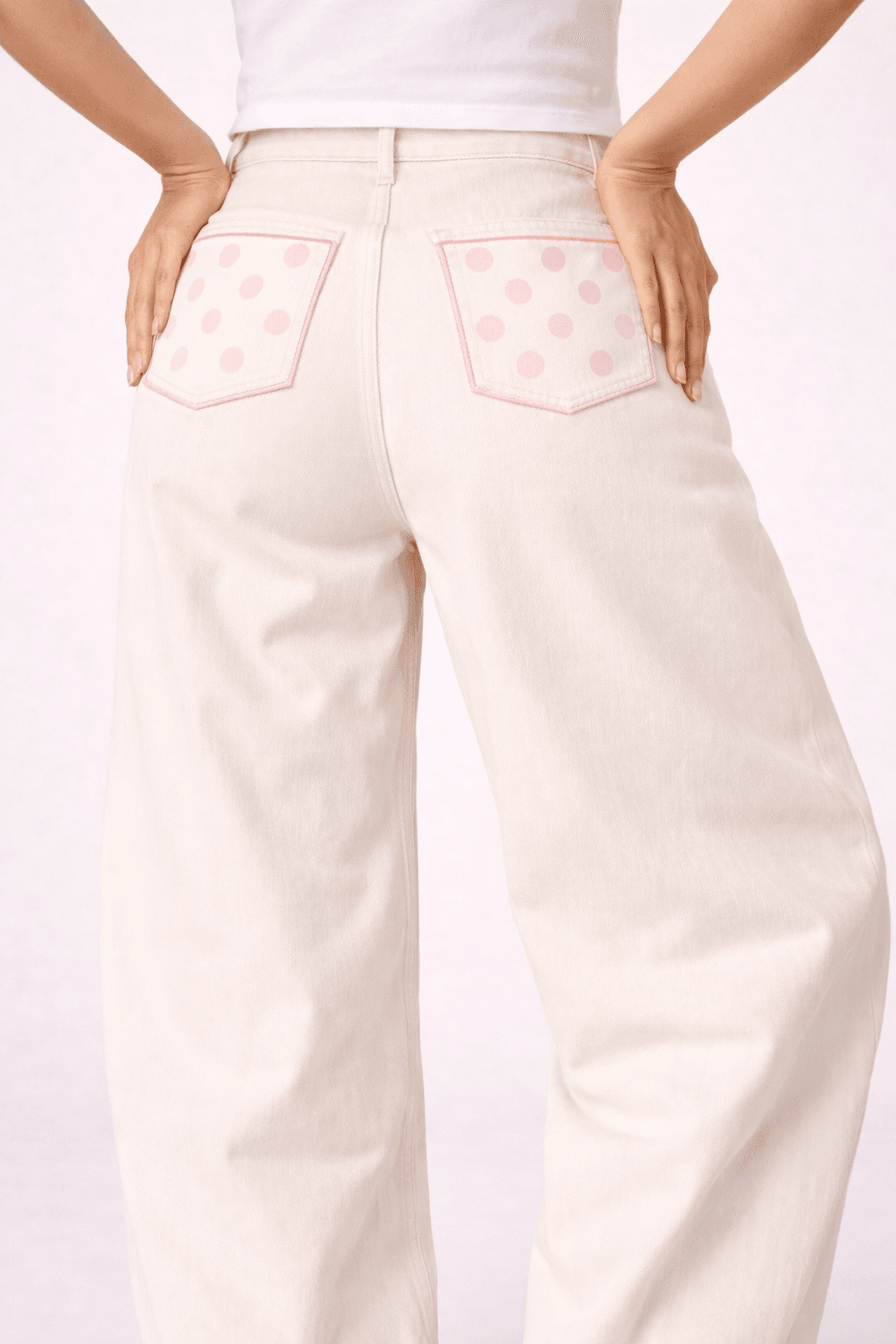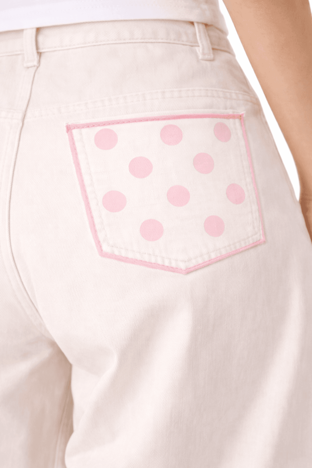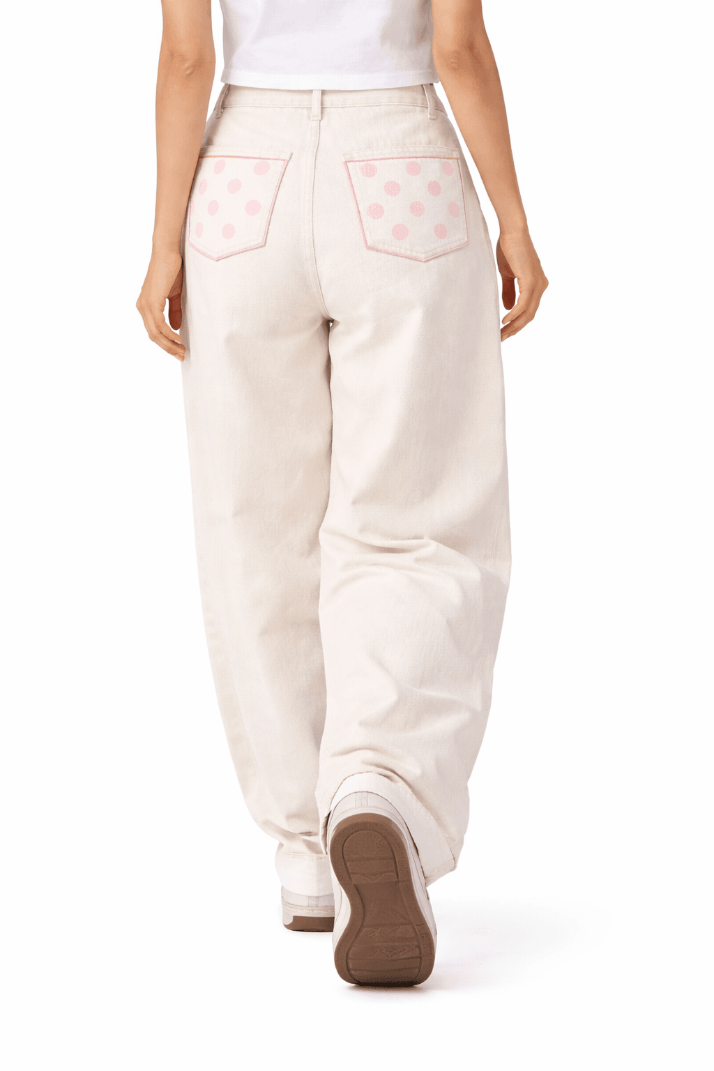 Candy Dot Back è un jeans baggy balloon off white con pois dipinti a mano sulle tasche posteriori. Un capo unico che unisce denim di qualità e lavorazione artigianale. Ogni paio è dipinto a mano, rendendo ciascun jeans leggermente diverso e quindi esclusivo.