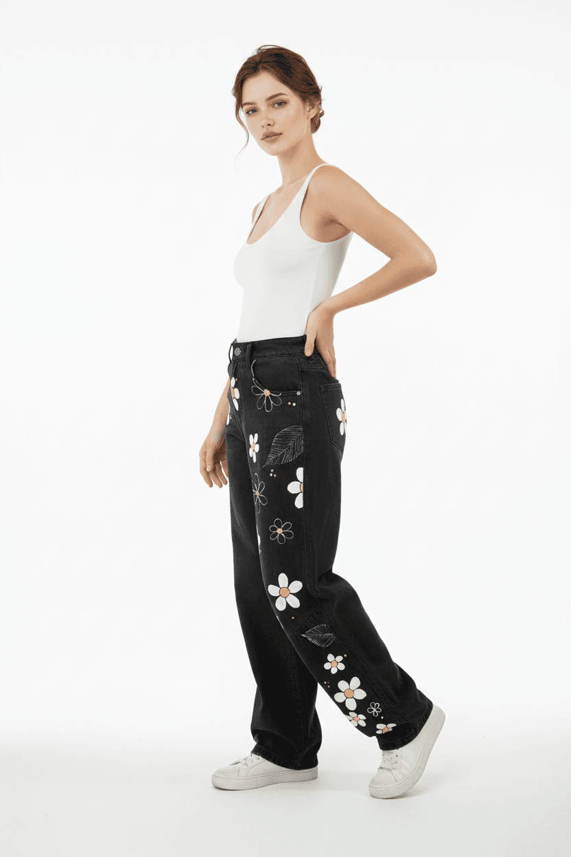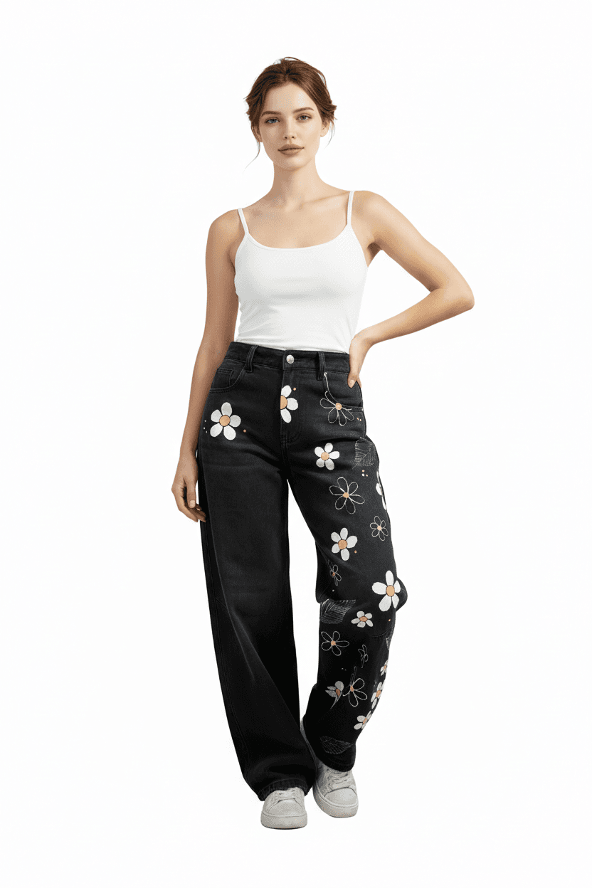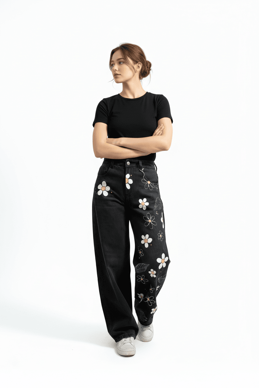 La vestibilità morbida con gamba larga garantisce comfort e libertà di movimento, mentre le decorazioni floreali aggiungono un dettaglio distintivo che trasforma un jeans quotidiano in un capo speciale.