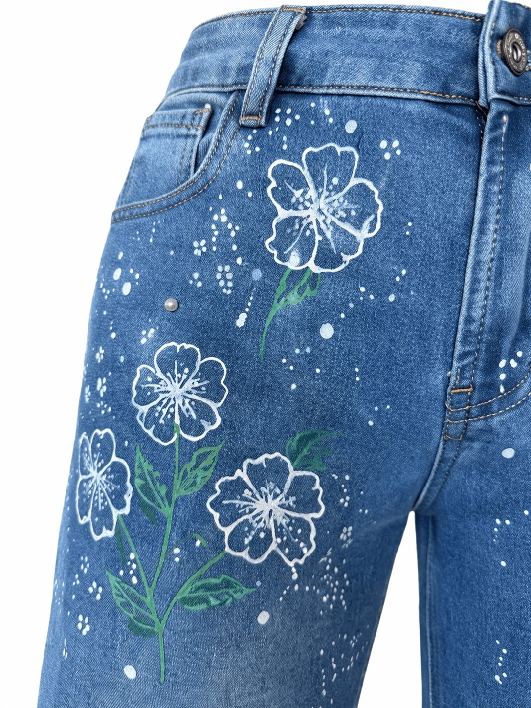 Petaline è un jeans in denim dal fit rilassato e femminile, decorato con delicati fiori bianchi diffusi su tutta la superficie e arricchito da perle bianche applicate che donano luce e raffinatezza al modello. Un capo originale ma facile da indossare, perfetto per aggiungere un tocco romantico e ricercato anche agli outfit più semplici. Ideale da abbinare a t-shirt, top e camicie per un look fresco, elegante e distintivo.